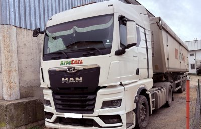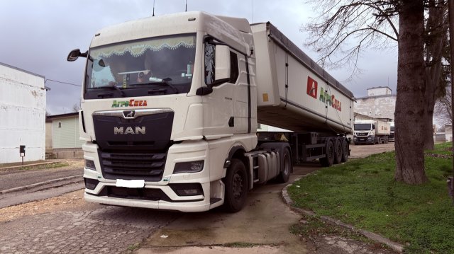 *Композиция с 3-осно полуремарке със самосвална настройка Schmitz Cargobull, тип SKI 24 SL 9.6, обем 50 куб. м. с обща цена 79 570.00 евро без ДДС